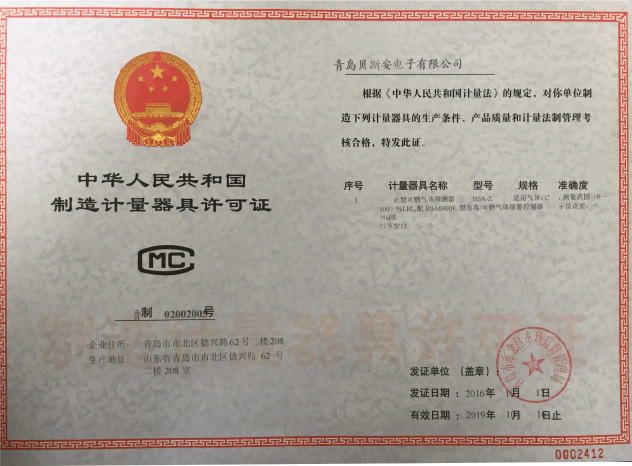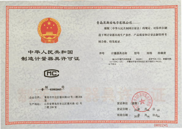 我公司是青島市具有國家質(zhì)量技術(shù)監(jiān)督部門頒發(fā)的計量器具生產(chǎn)許可證的生產(chǎn)企業(yè);獲得國家防爆電氣產(chǎn)品質(zhì)量監(jiān)督檢驗(yàn)中心頒發(fā)的防爆合格證;獲得國家公安部消防產(chǎn)品合格評定中心頒發(fā)的消防產(chǎn)品形式認(rèn)可證書。